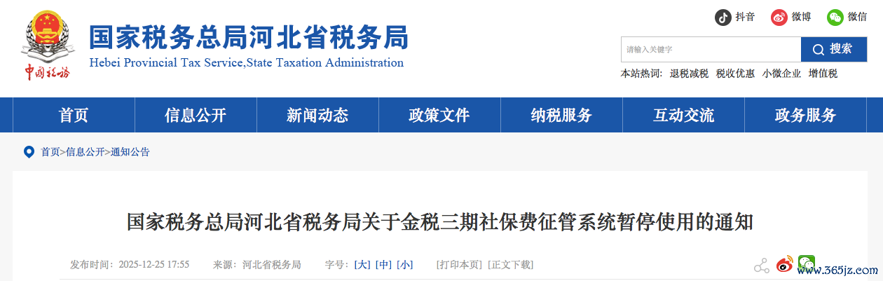 国度税务总局河北省税务局对于金税三期社保费征管系统暂停使用的奉告